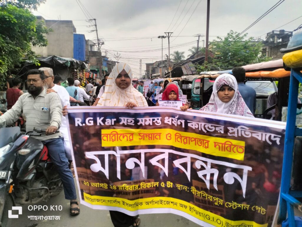 শাহনাওয়াজ খান: আরজি কর মেডিকেল কলেজ হাসপাতালে জুনিয়র মহিলা ডাক্তারের ওপর ঘটে যাওয়া অমানবিক নির্যাতন ও হত্যার প্রতিবাদে গার্লস ইসলামিক অর্গানাইজেশন অফ ইন্ডিয়া (GIO) হাওড়া জেলার উলুবেড়িয়া ব্লক শাখার উদ্যোগে এক র্যালি ও মানববন্ধন অনুষ্ঠিত হয়। রবিবার ২৫ আগস্ট এই প্রতিবাদ মিছিলে অংশ নেন জিআইও-র প্রায় ৫০ জন সদস্যা। বীরশিবপুর পঞ্চায়েত অফিস থেকে র্যালি শুরু হয় এবং শেষে বীরশিবপুর চৌমাথা মোড়ে এসে মানববন্ধনে পরিণত হয়।